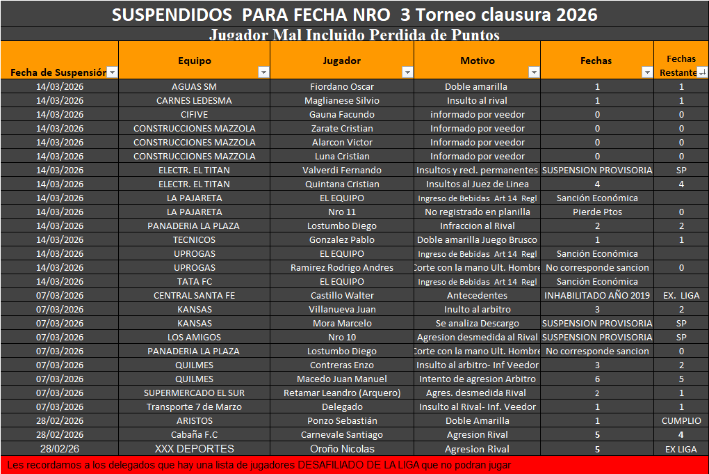 Tabla de Suspensiones
